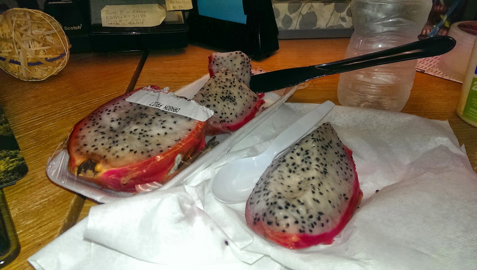 I have been dying to try the dragon fruit! It sounds and look every exotic and it is. This past Saturday I went to the big Asian market and bought fresh cut dragon fruit, lychees, and many other things. For some odd reason I was scared to taste it by myself. I have a vegan co-worker who is down for trying any kinds of fruit or vegetables.